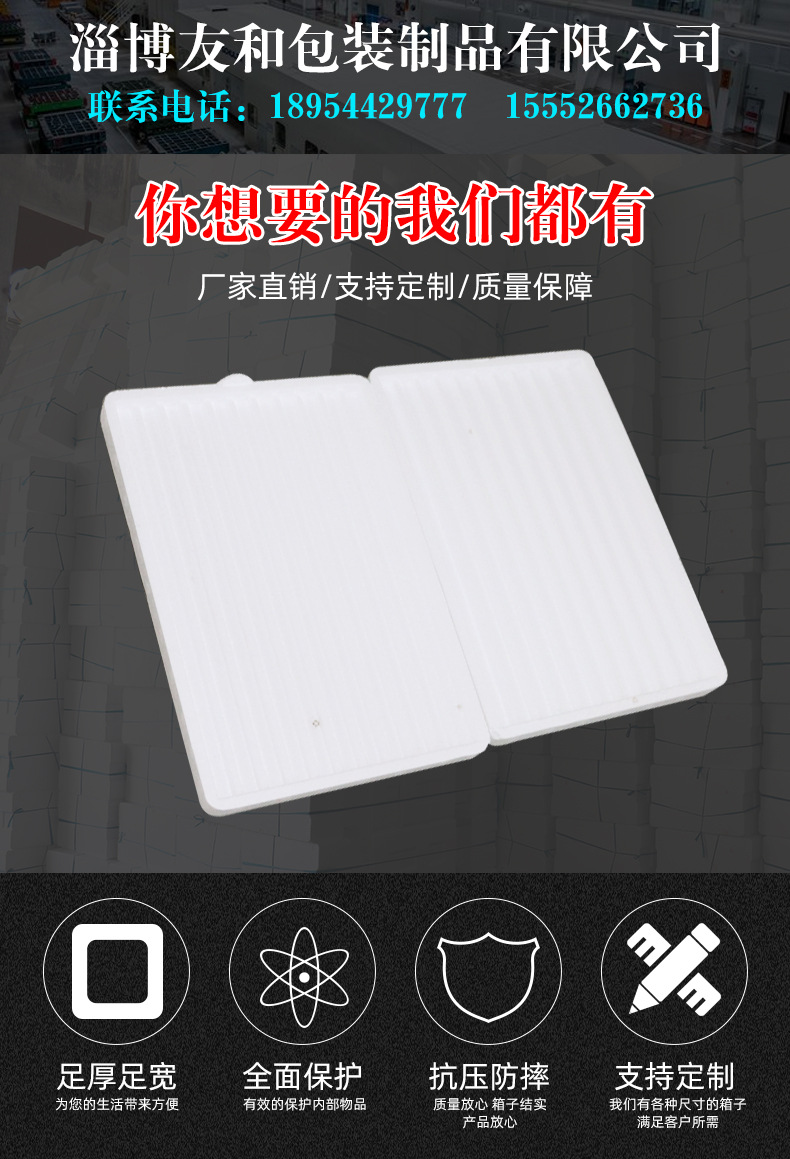 介紹參數圖冊 ????淄博友和包裝制品有限公司是專業的山東泡沫包裝箱加工廠家,本廠主要產品有:泡沫包裝箱,泡沫保鮮箱,水果蔬菜泡沫包裝箱,水果蔬菜泡沫保鮮箱,瓷磚泡沫包裝箱等,產品暢銷全國,深受用戶好評。泡沫包裝定做可以聯系我們網站 http://www.ny4455.cn/ 上電話,我們會第一時間跟您聯系。 上一篇棉花糖機防壓泡沫包裝盒 下一篇普通電瓶包裝泡沫箱